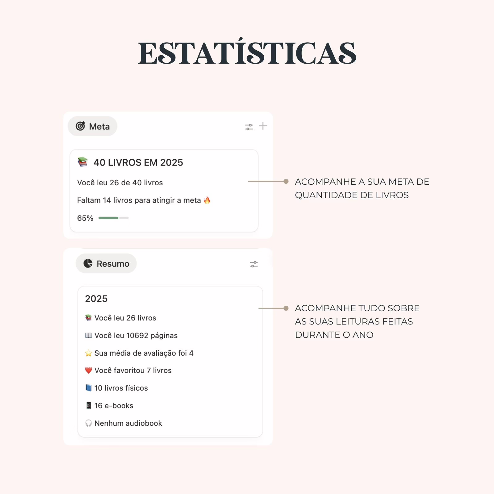 – Estatísticas automáticas — veja resumo do ano com número de livros, páginas, formatos e médias de avaliação.