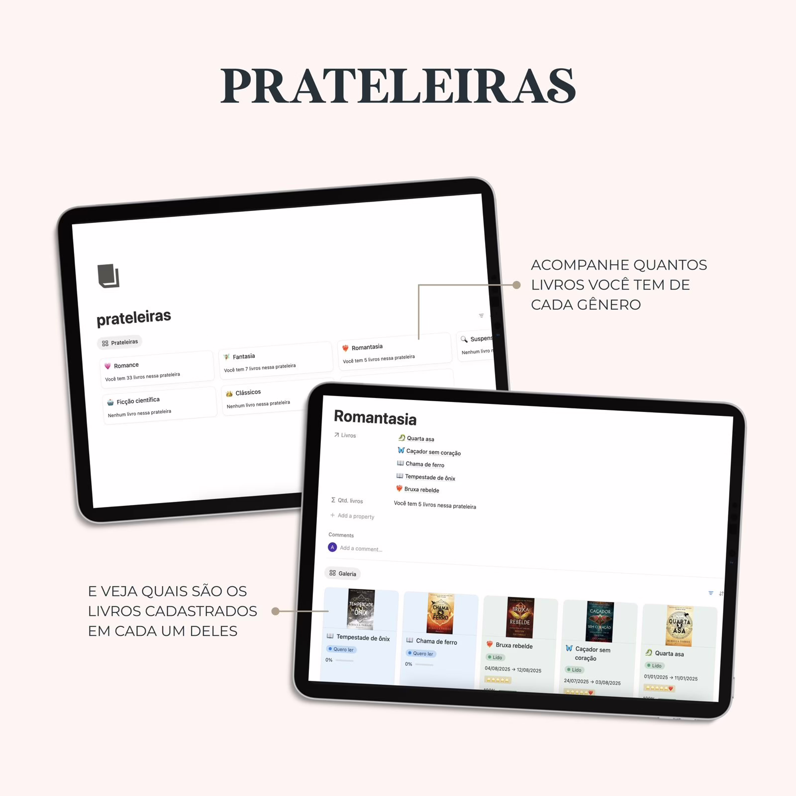 Feito especialmente para leitores que amam acompanhar cada livro lido, planejar próximas leituras e ver o progresso tomando forma — tudo em um só lugar!