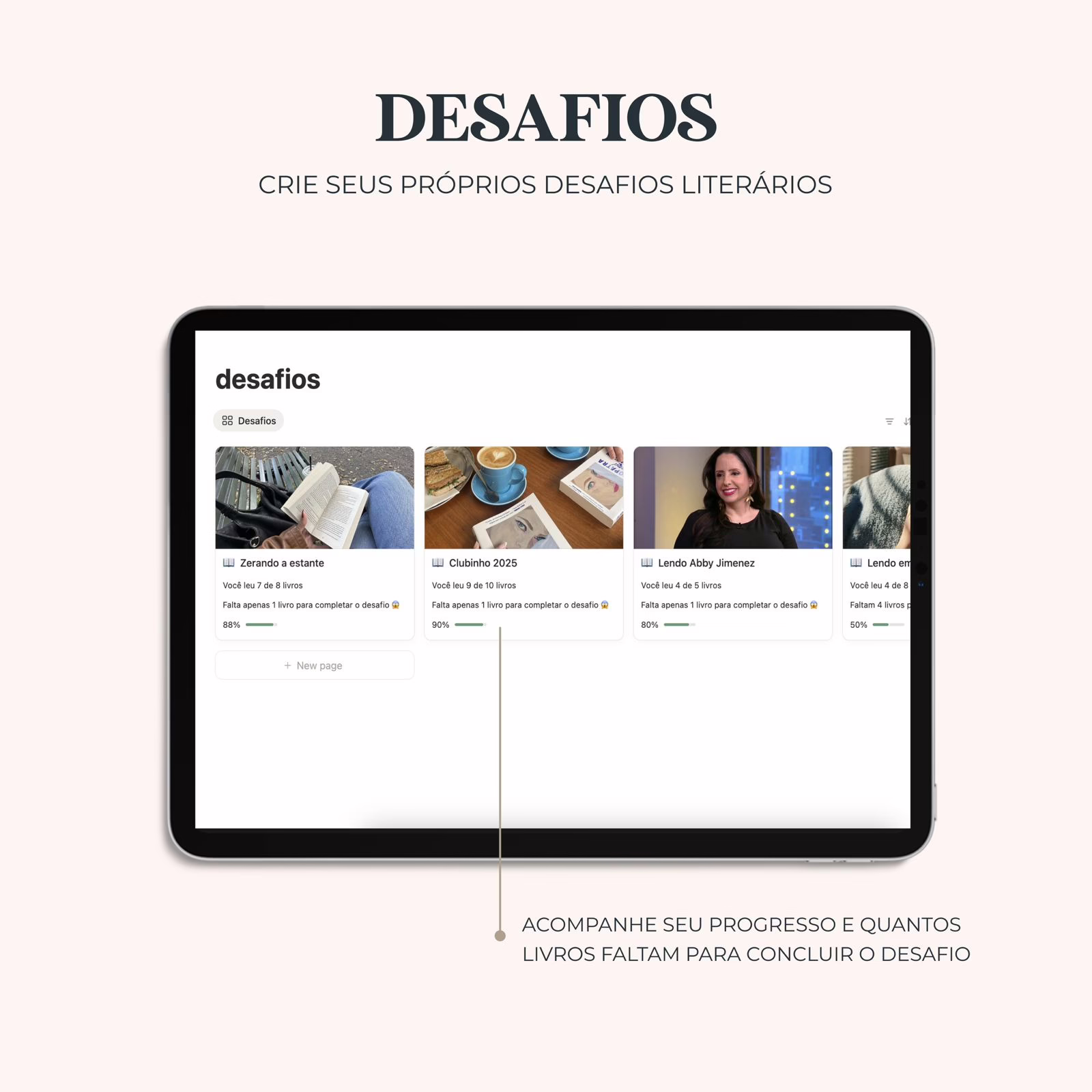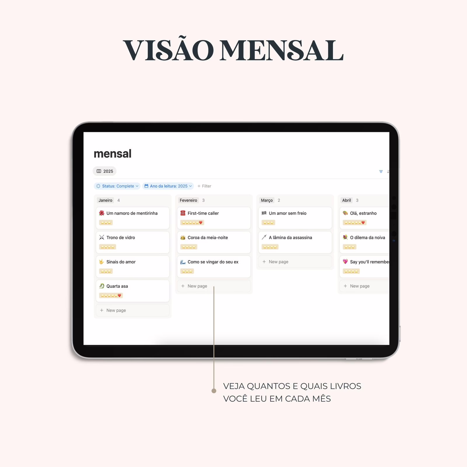 Nosso template conta com tudo que você precisa para acompanhar o seu ano de leitura:
